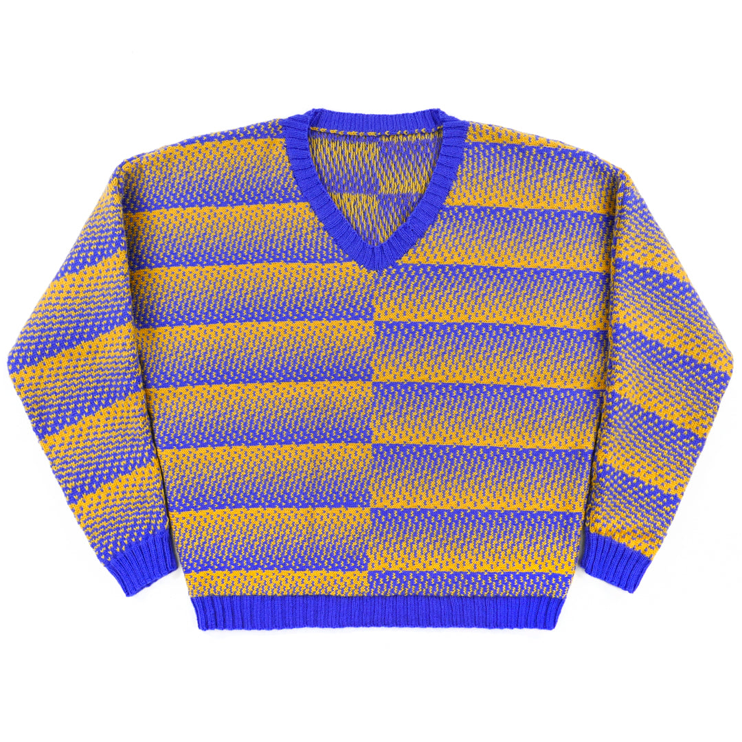 This sweater was knit in just two pieces, the front and the back. While knitting, the 2-color pattern transitions between horizontal and vertical stripes to create a continuous effect when worn on the body.